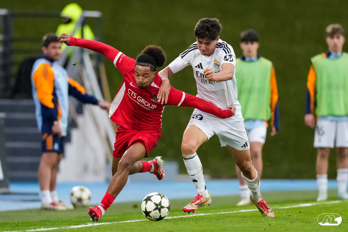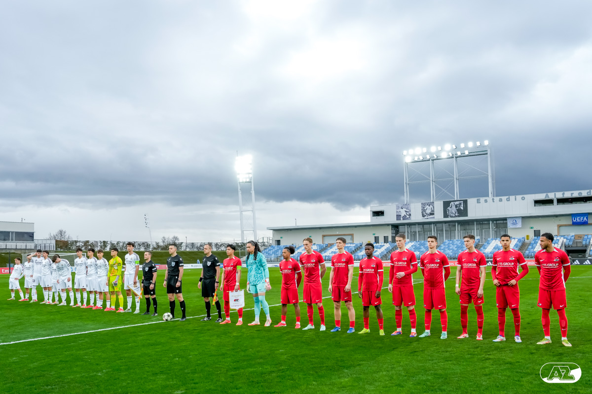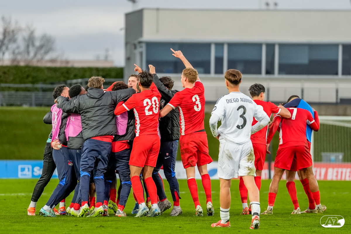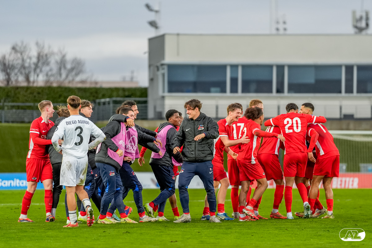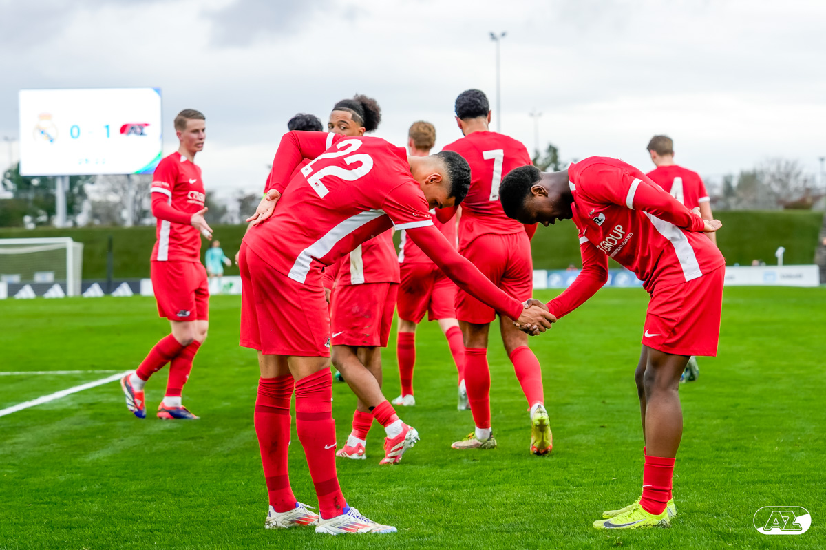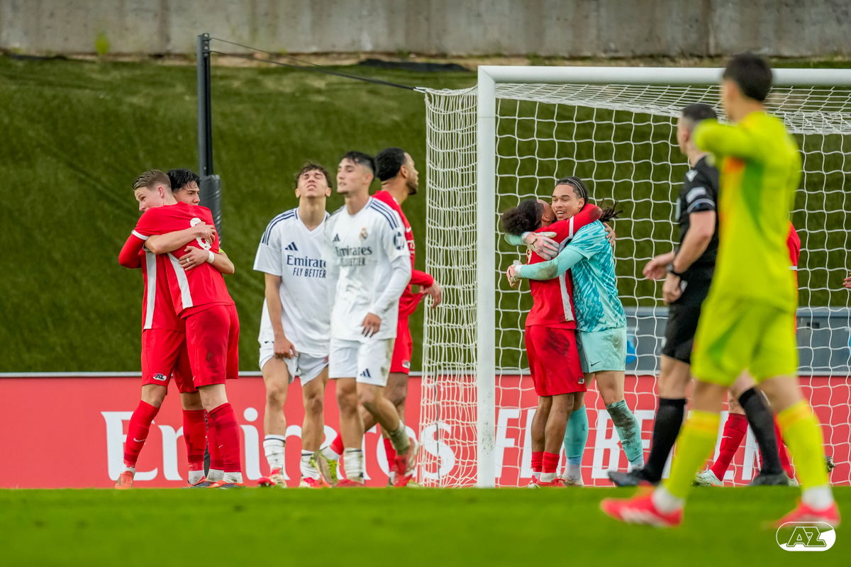 MADRID- AZ Onder 19 plaatste zich woensdagmiddag voor de kwartfinale van de UEFA Youth League. In het Estadio Alfredo Di Stéfano werd het Spaanse Real Madrid met 0-2 verslagen. Wassim Bouziane en Anthony Smits waren trefzeker namens de Alkmaarders. De overwinning in beeld. (Foto's: Ed van de Pol).