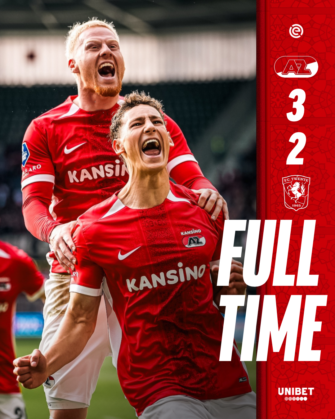 ALKMAAR- AZ verzekerde zich zondagavond van een nieuw Europees seizoen. Na een knotsgekke 3-2 overwinning op FC Twente sluiten de Alkmaarders het seizoen af als winnaar van de play-offs. Hiermee plaatst de ploeg van hoofdtrainer Maarten Martens zich voor de voorrondes van de UEFA Conference League.