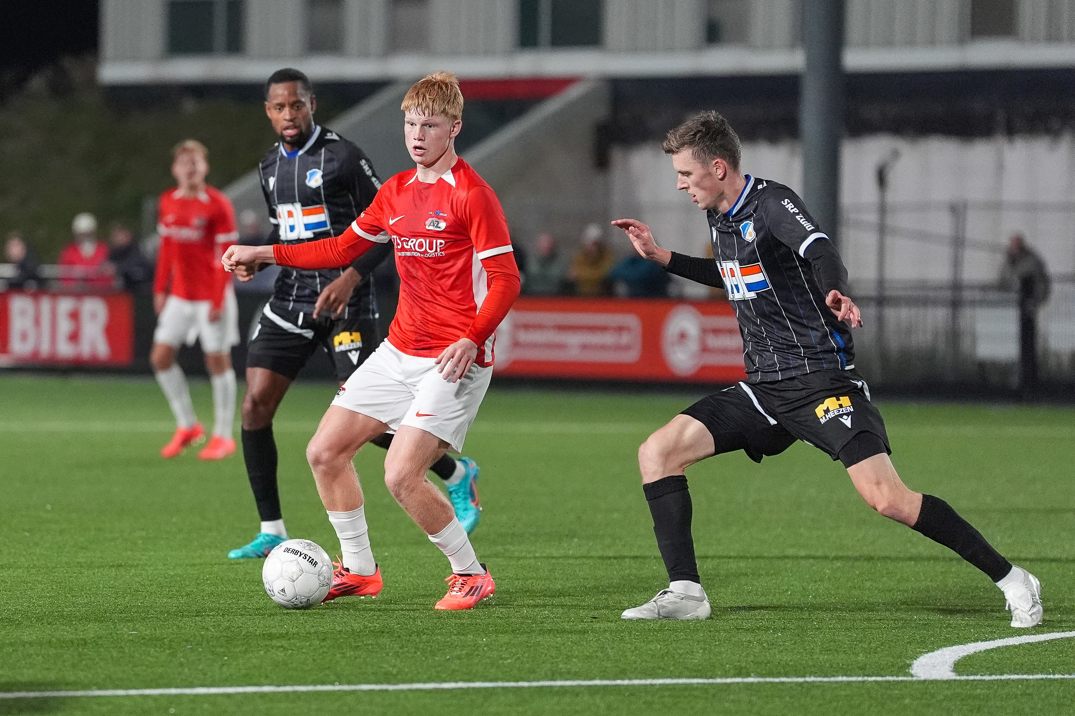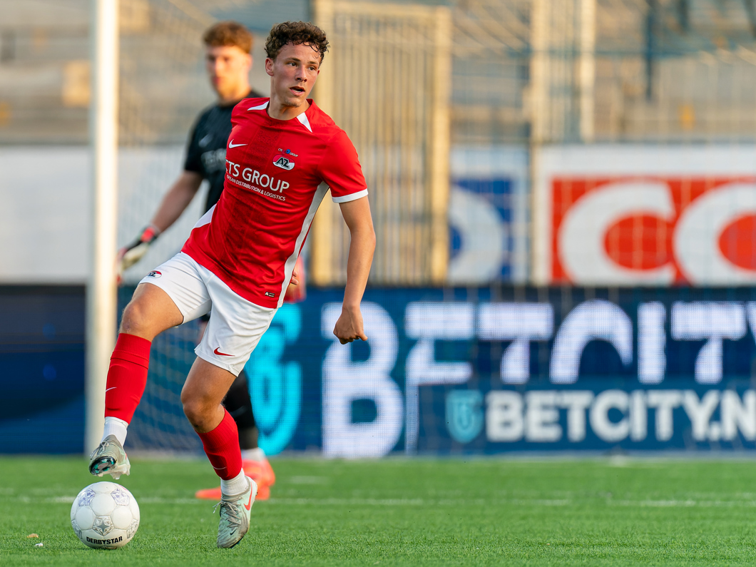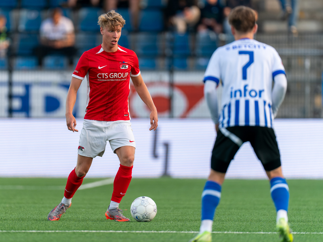De nummer tien van Jong AZ zoekt de eerste paal van dichtbij, maar de inzet wordt geblokt.