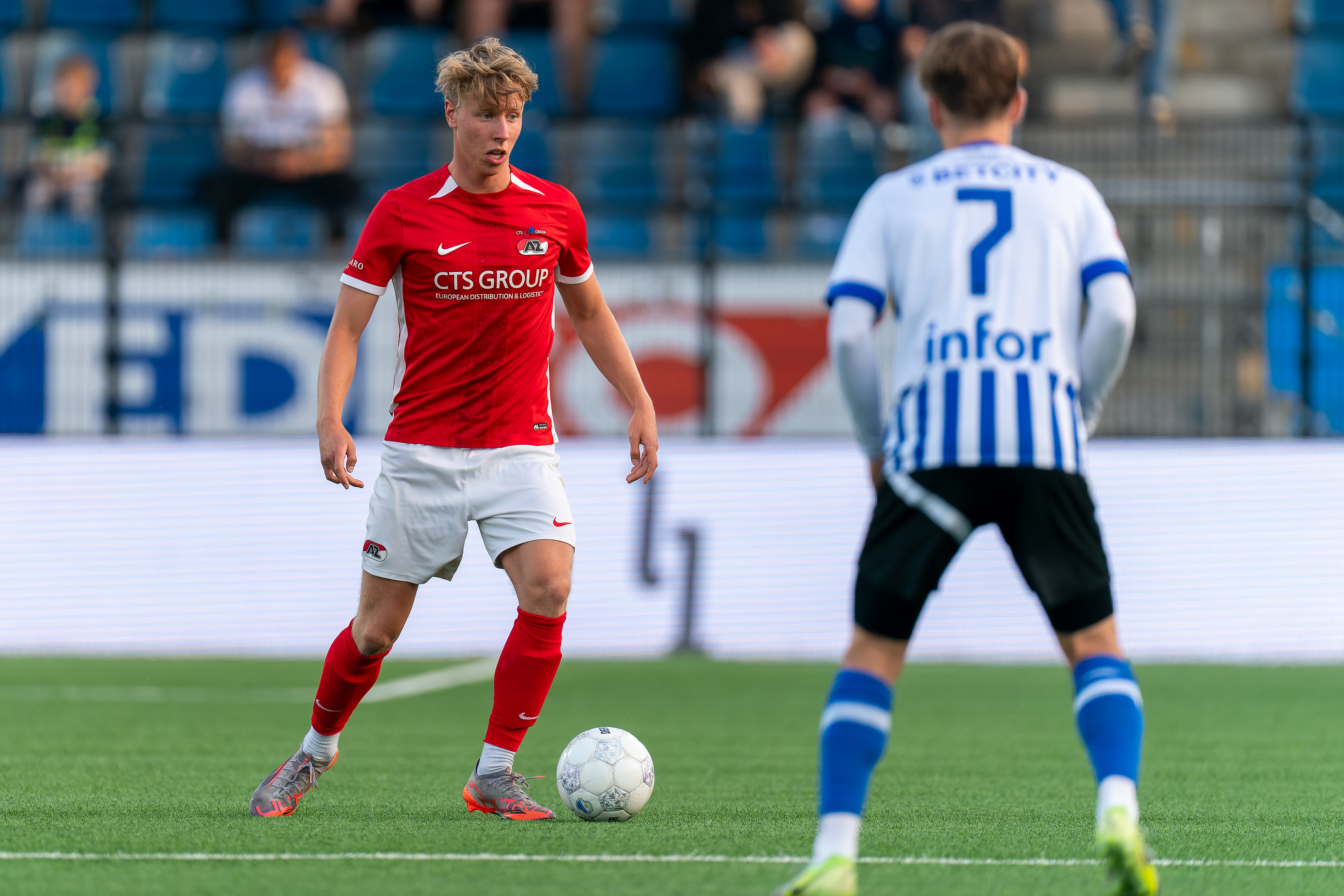 Sem van Duijn komt vrij in het strafschopgebied en haalt uit, maar keeper Jorn Brondeel voorkomt een vroege Alkmaarse voorsprong.