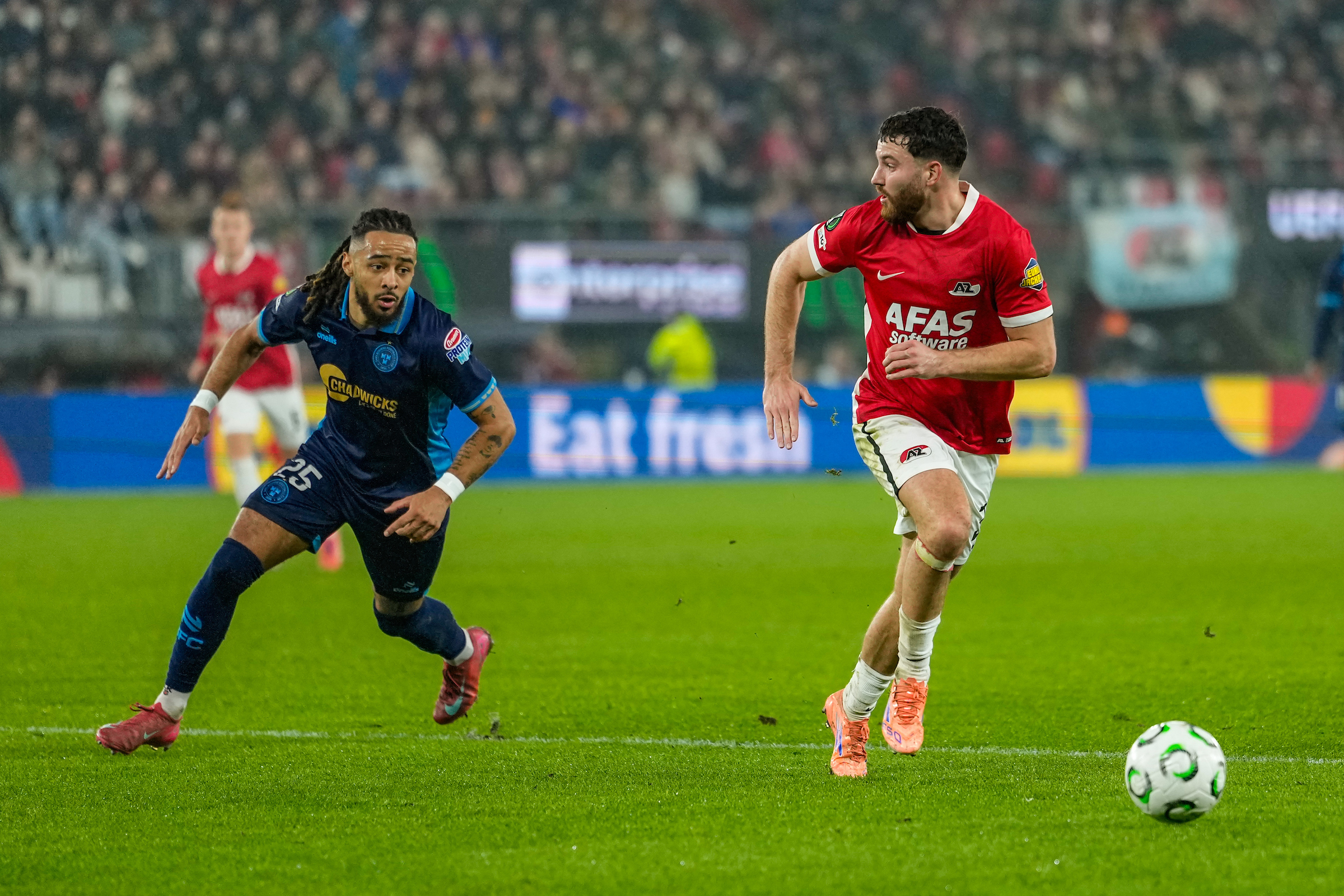 De invaller komt oog in oog met keeper Rome-Jayden Owusu-Oduro, maar krijgt de bal niet langs de Alkmaarse keeper.