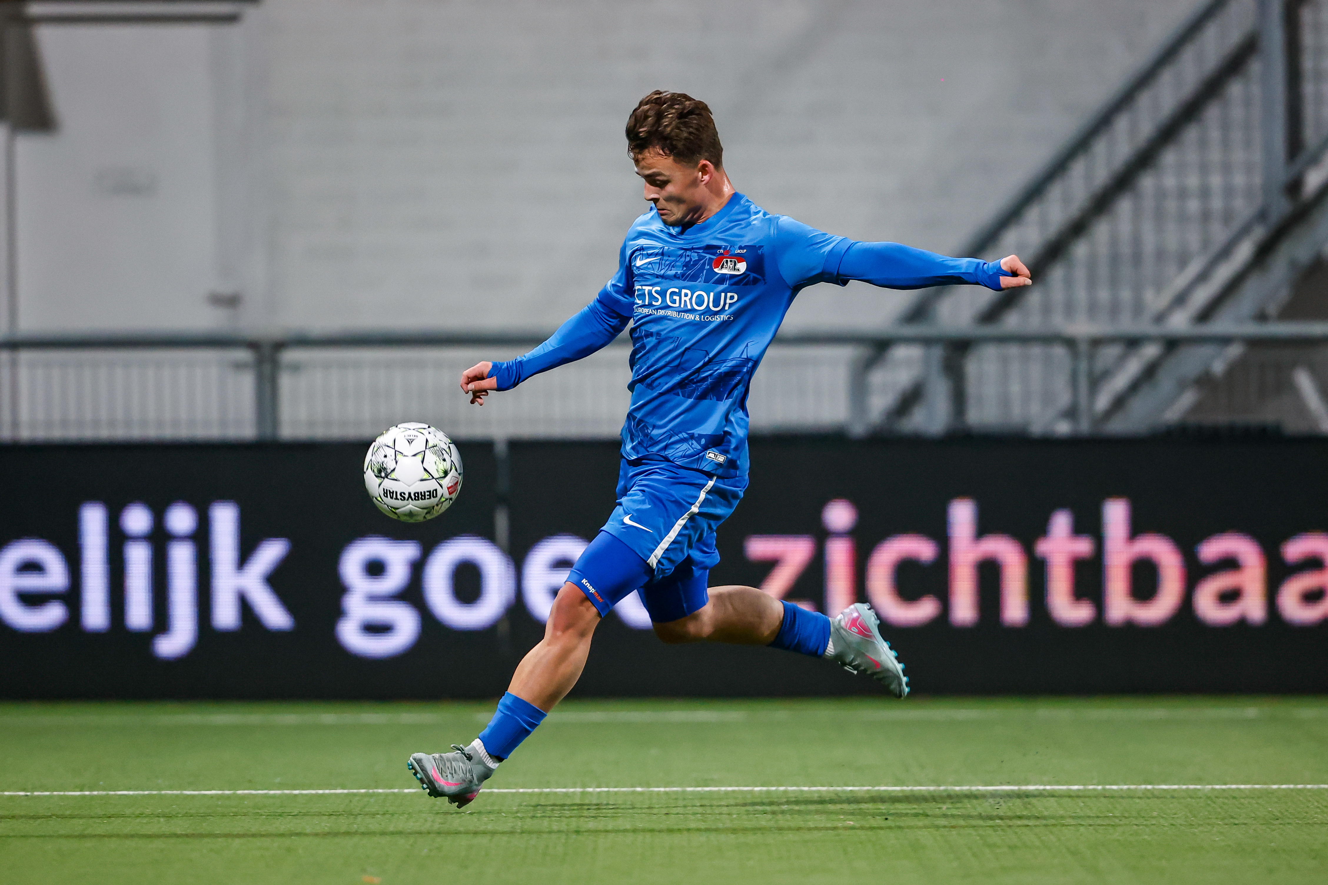 Jasper Hartog haalt van afstand verwoestend uit en ziet zijn schot weergaloos de kruising invliegen.