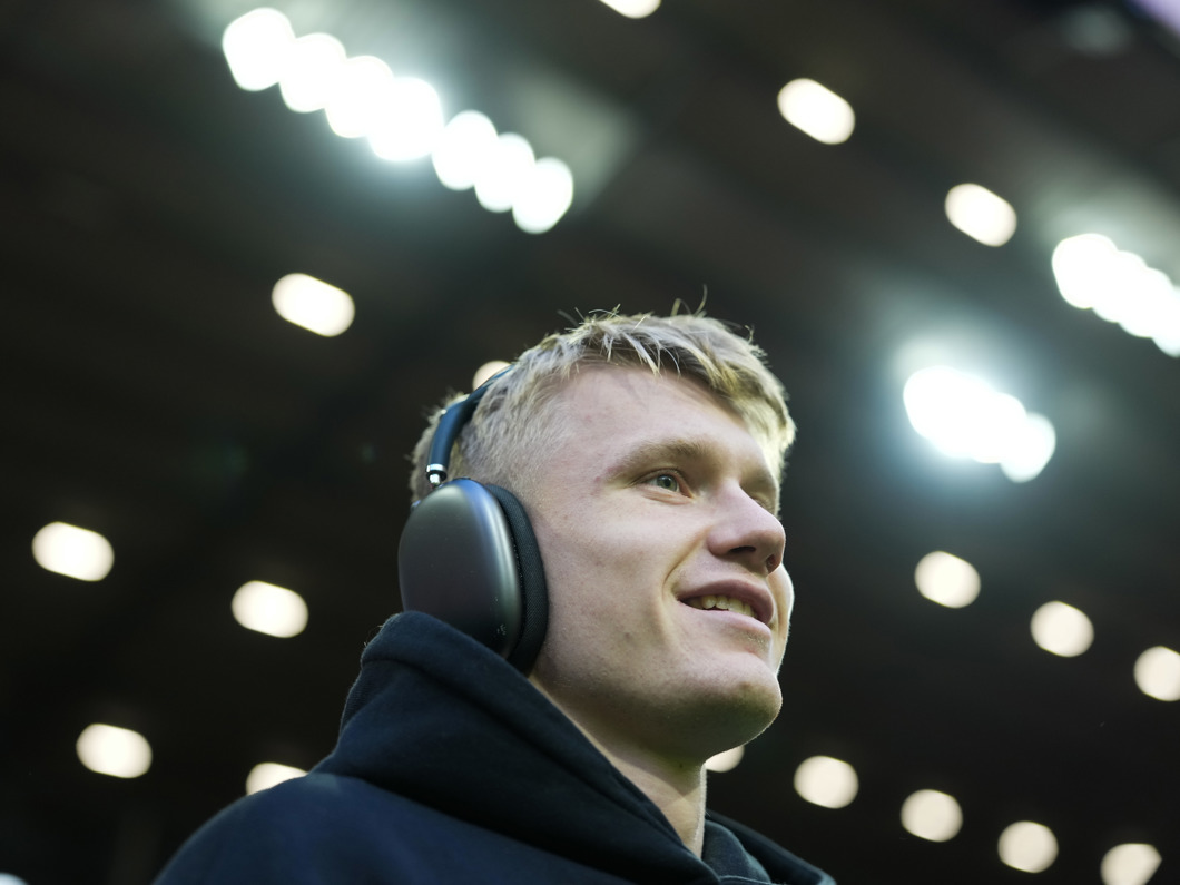 De bal gaat op de stip na een overtreding op Troy Parrott.