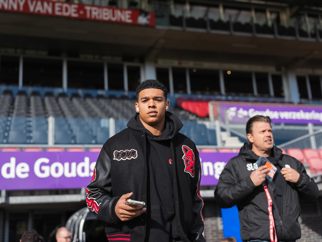 De jonge middenvelder probeert het met een schot van afstand, maar de poging krult langs het doel van de Rotterdammers