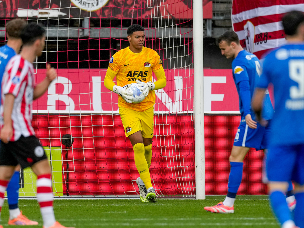 De Alkmaarse keeper maakt een belangrijke redding op de doorbraak van invaller Ayoni Santos.