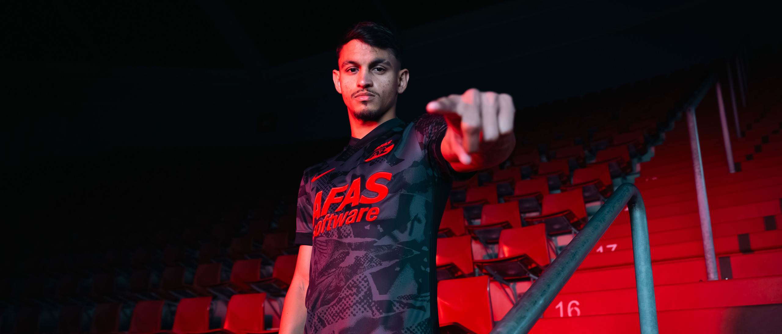 Nadat alle trappen in ons stadion door AFAS rood zijn geverfd, trekken we die lijn nu door naar het veld. Het nieuwe derde tenue is een krachtig zwart ontwerp met op ieder shirt een unieke opdruk. Het zwarte shirt kleurt rood door de opvallende bedrukking – een eerbetoon aan de clubkleur die we met trots dragen. In de nek is een subtiel detail verwerkt van het uitshirt van het seizoen 2019-2020.