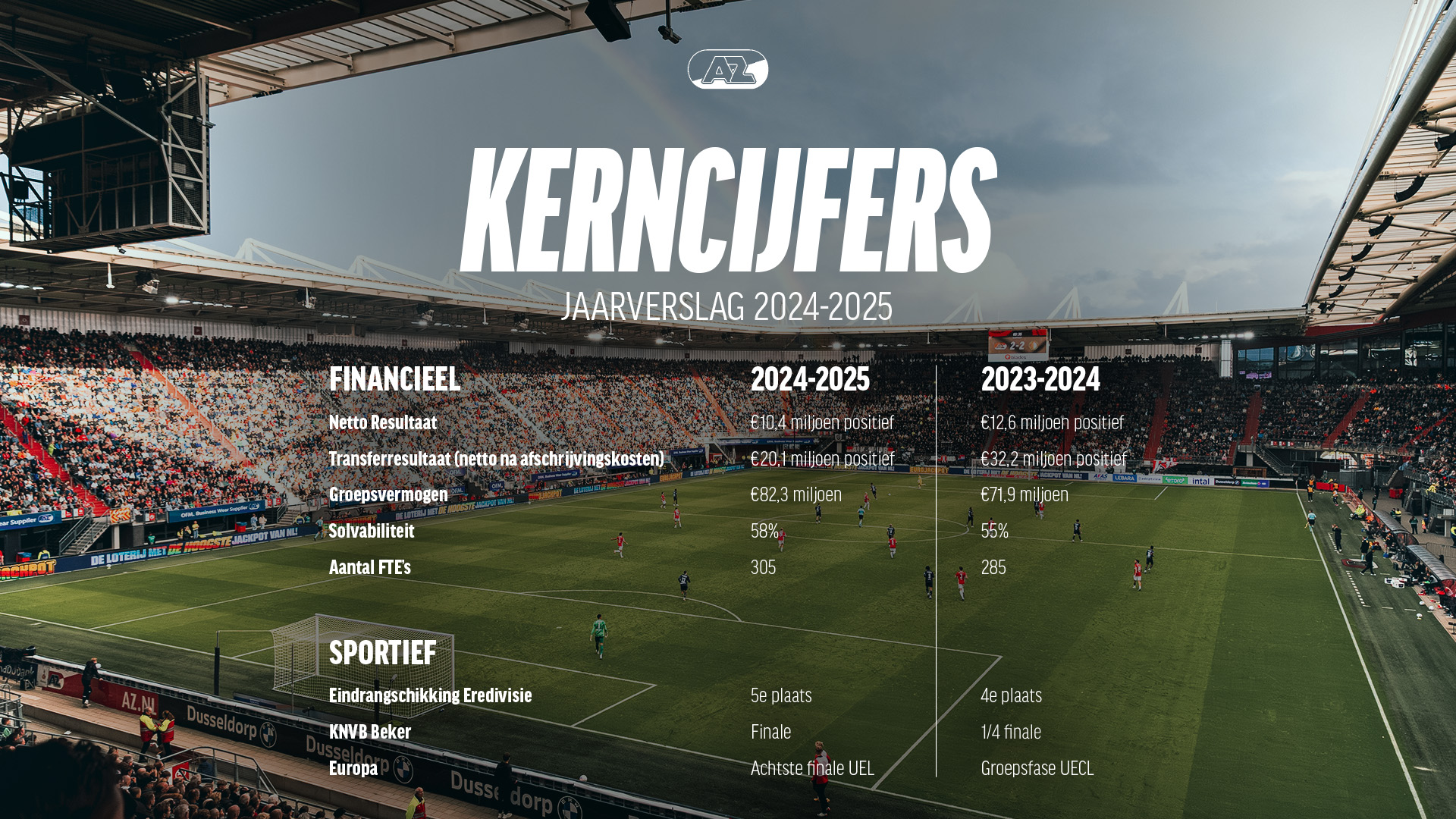 In het seizoen 2025-2026 werkt AZ wederom met een negatief operationeel resultaat voor transferinkomsten en afschrijving op vergoedingssommen, maar verwachten wij een positief netto resultaat vanwege de plaatsing voor de groepsfase van de Conference League alsmede reeds gerealiseerde transfers in de zomer van 2025. Transfersommen worden steeds meer gespreid betaald, waardoor AZ pas op termijn deze gelden zal ontvangen. Een deel van de transferopbrengsten wordt geïnvesteerd in de exploitatie van AZ en daarnaast vinden er forse investeringen plaats in zowel het AFAS Stadion als het AFAS Trainingscomplex. Door de financiële resultaten van de afgelopen jaren heeft AZ een buffer opgebouwd en ziet AZ de toekomst met vertrouwen tegemoet.
