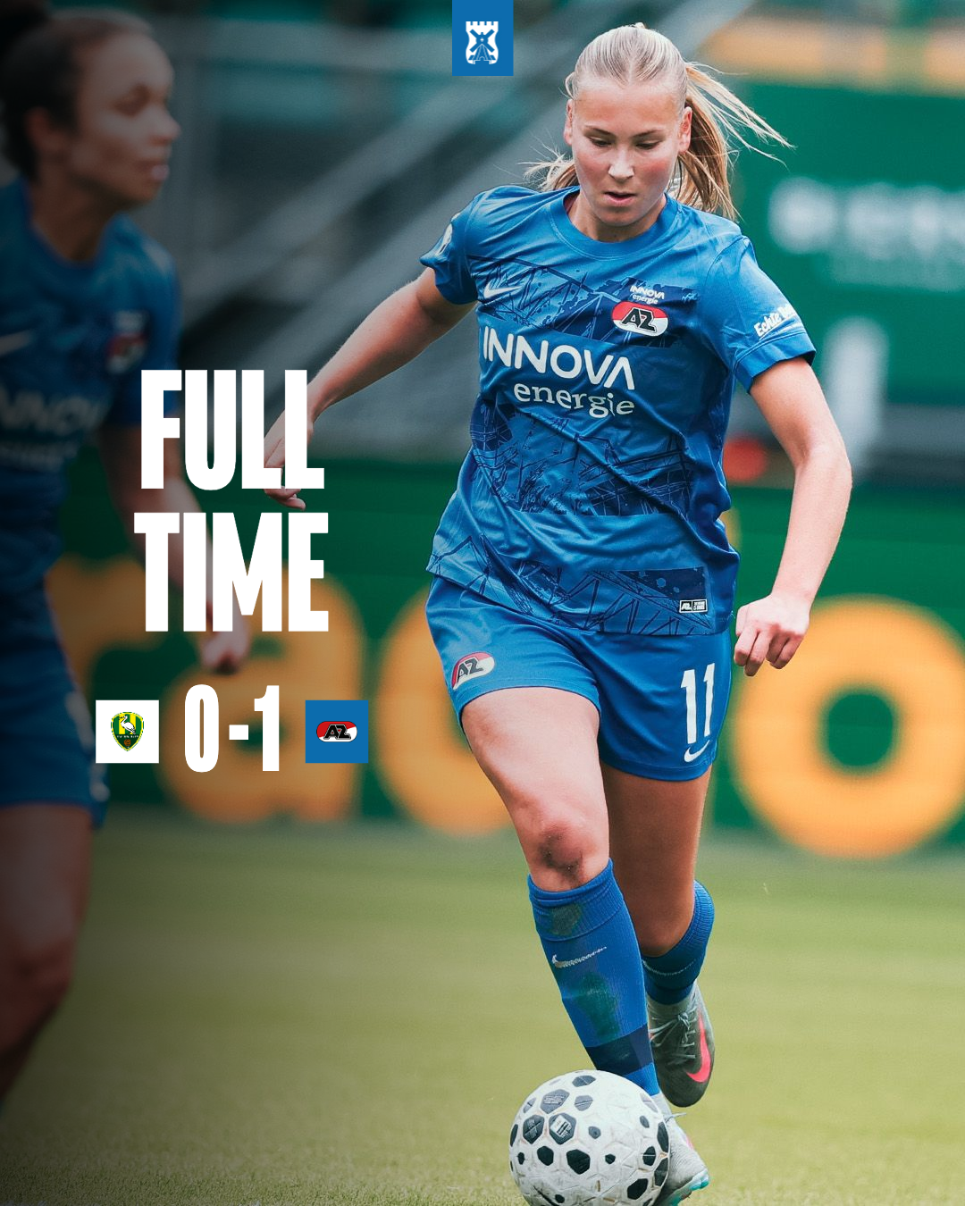 Oud-AZ'er Robin Blom ontvangt de bal in het strafschopgebied, maar Shanique Dessing is er op tijd bij en werkt de bal over de achterlijn.