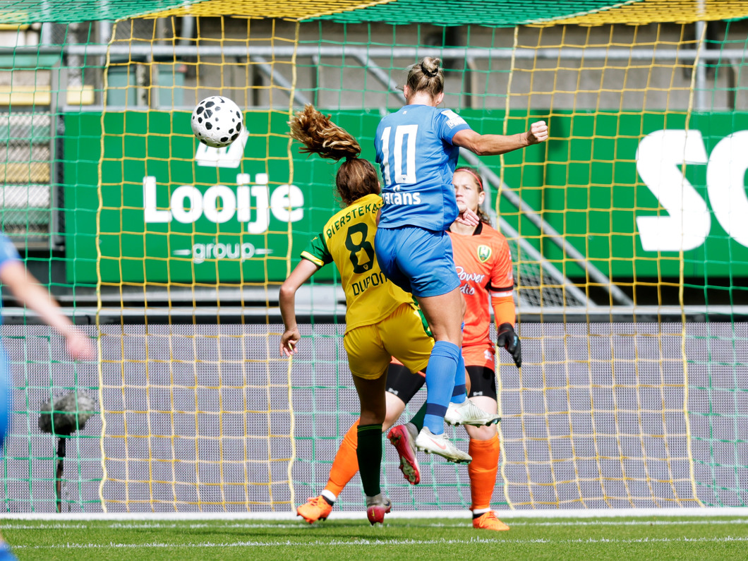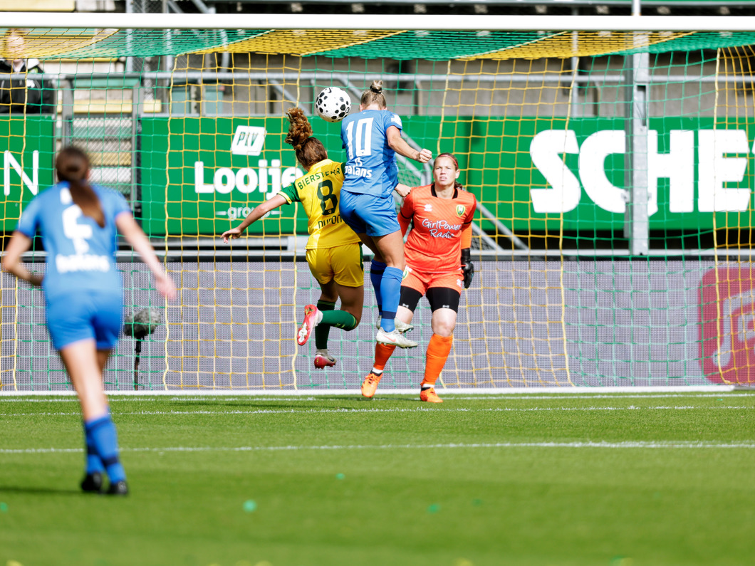 Via een corner wordt de bal hoog voorgelegd bij het doel. Aanvoerster Van Lunteren kopt op doel, maar de bal verdwijnt naast de paal.