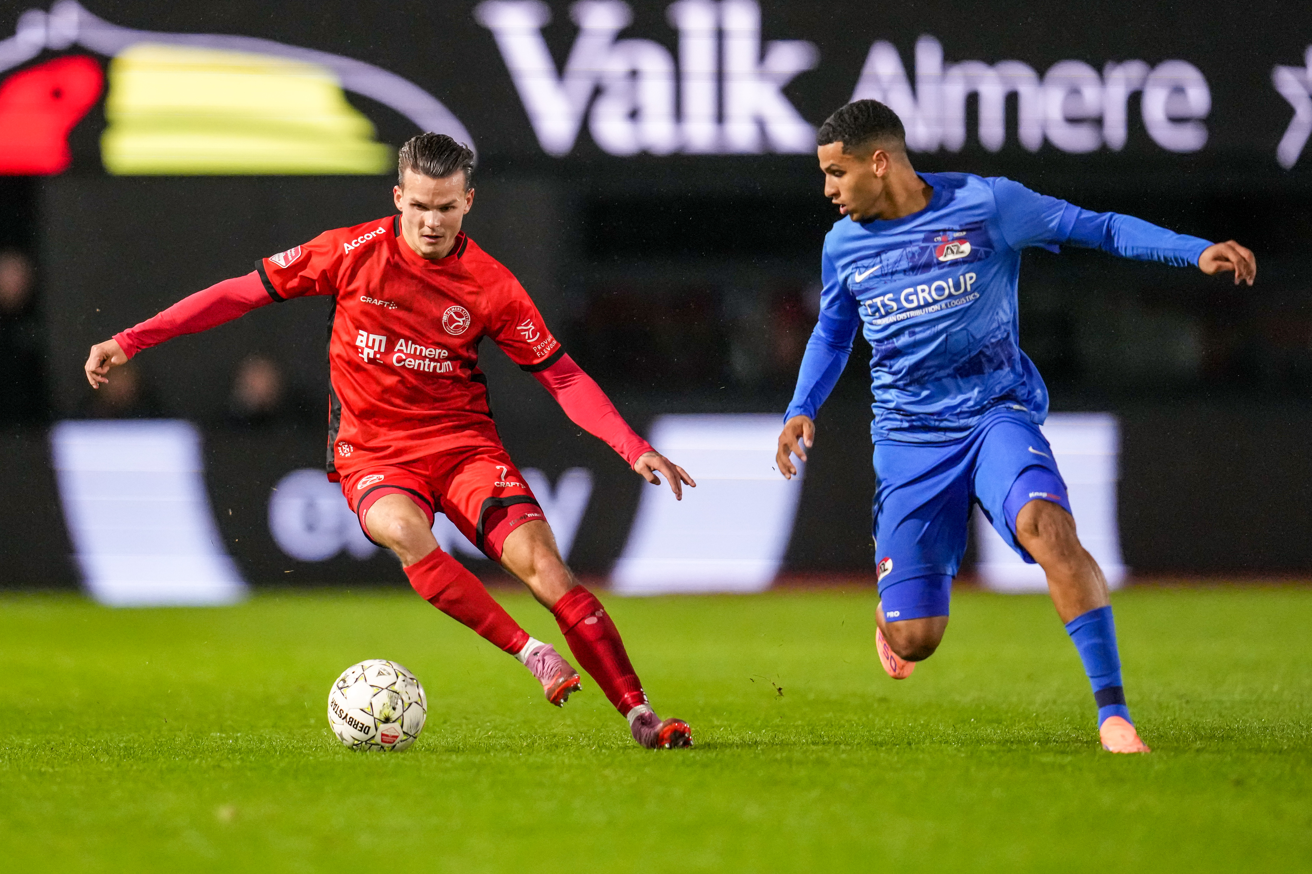 Na een fout in de opbouw bij Almere City komt Anthony Smits tot een kans, maar zijn schot gaat net naast.