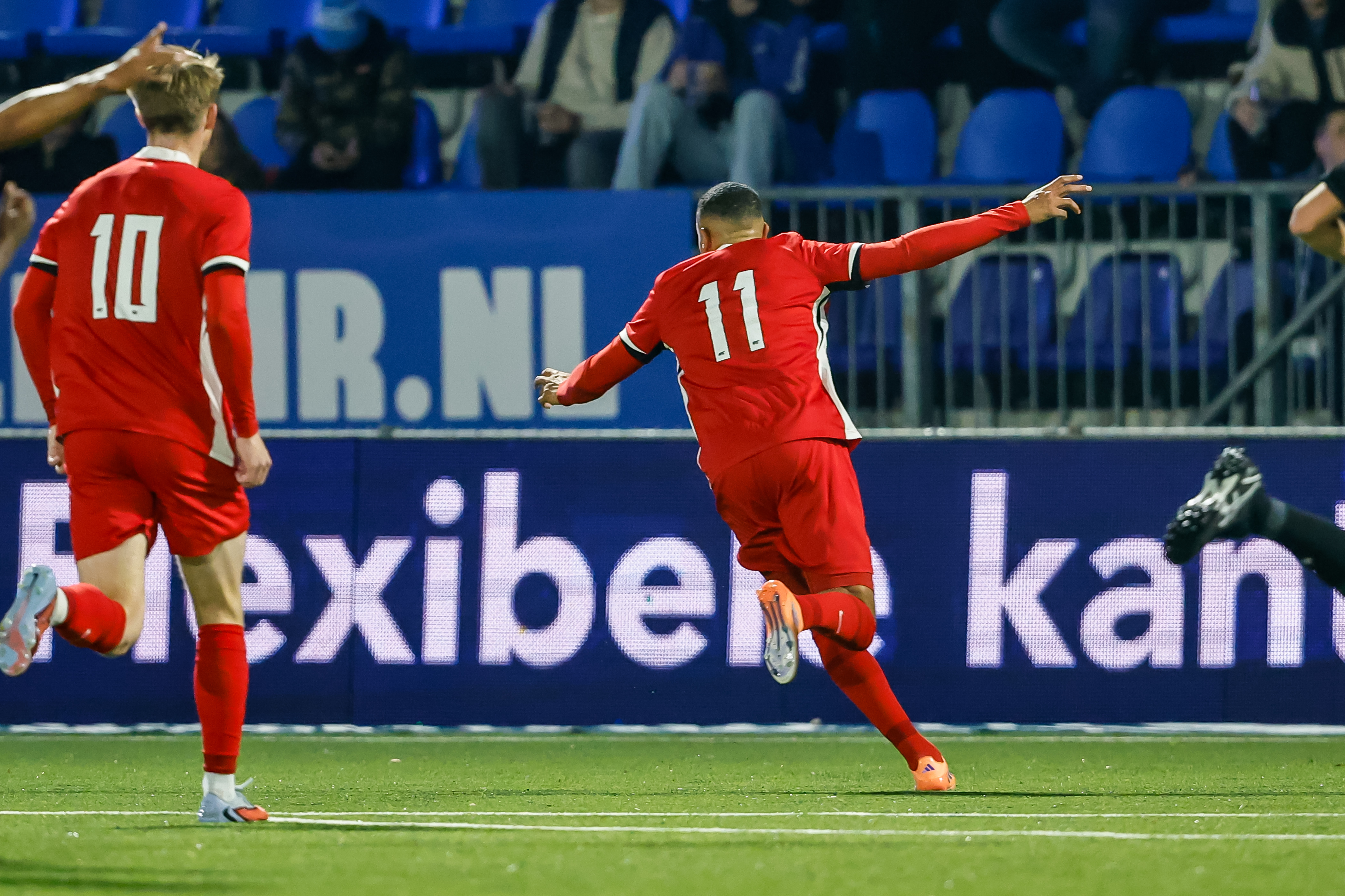 Basisdebutant Deacon van der Klaauw breekt door op de flank en schiet hard in het zijnet. Het blijft 1-1.