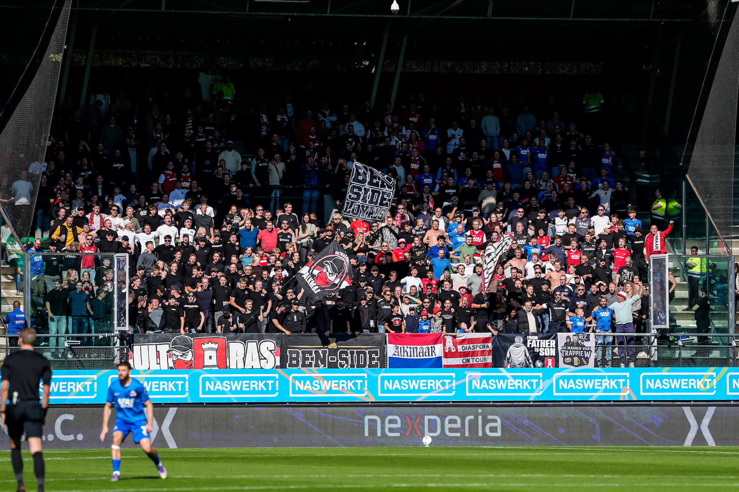 De aanvaller van de thuisploeg wordt bereikt met een voorzet en kopt vervolgens over het Alkmaarse doel.