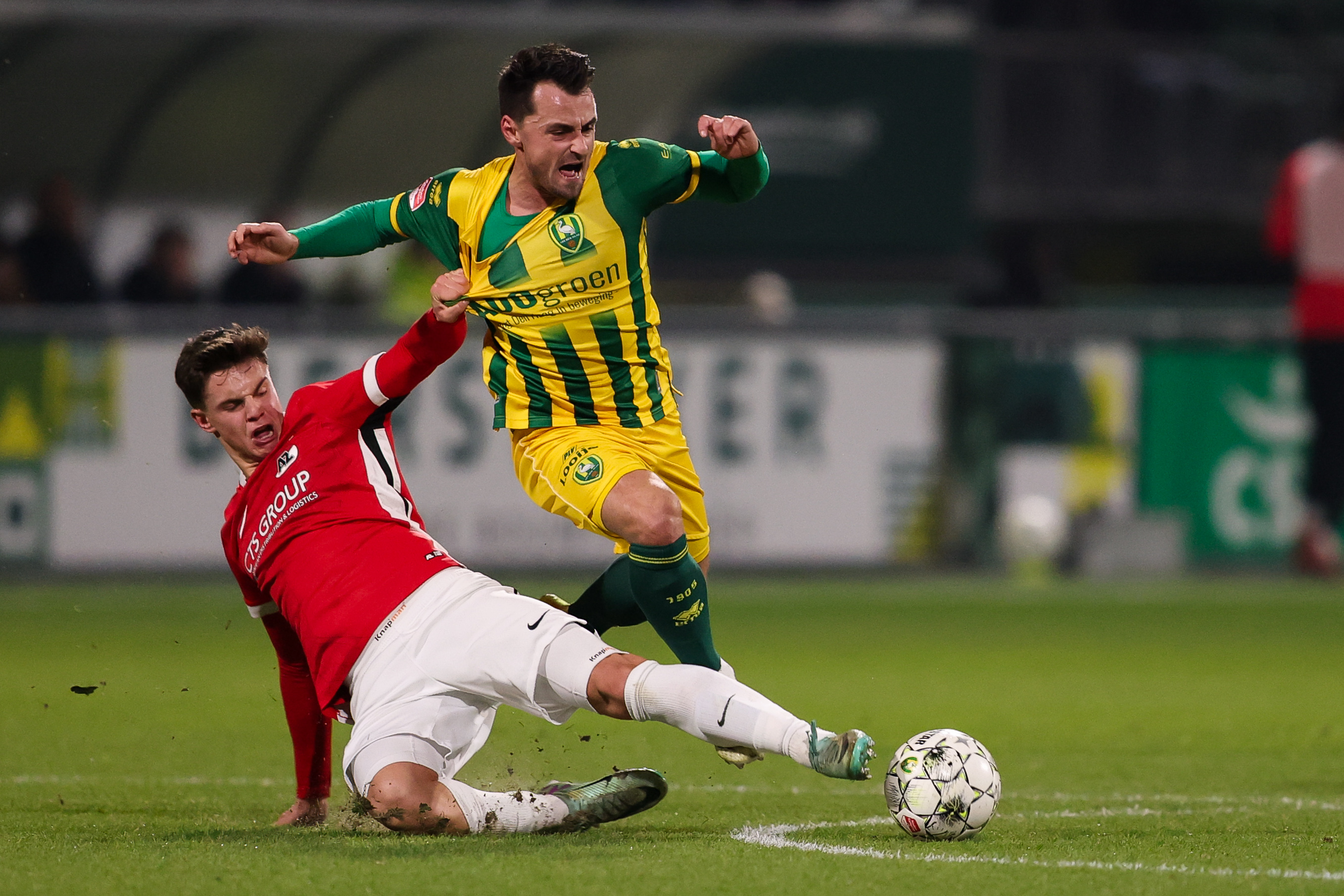 De aanvaller van ADO Den Haag wordt bereikt in het strafschopgebied en heeft tijd om uit te halen, maar mikt uiteindelijk over.