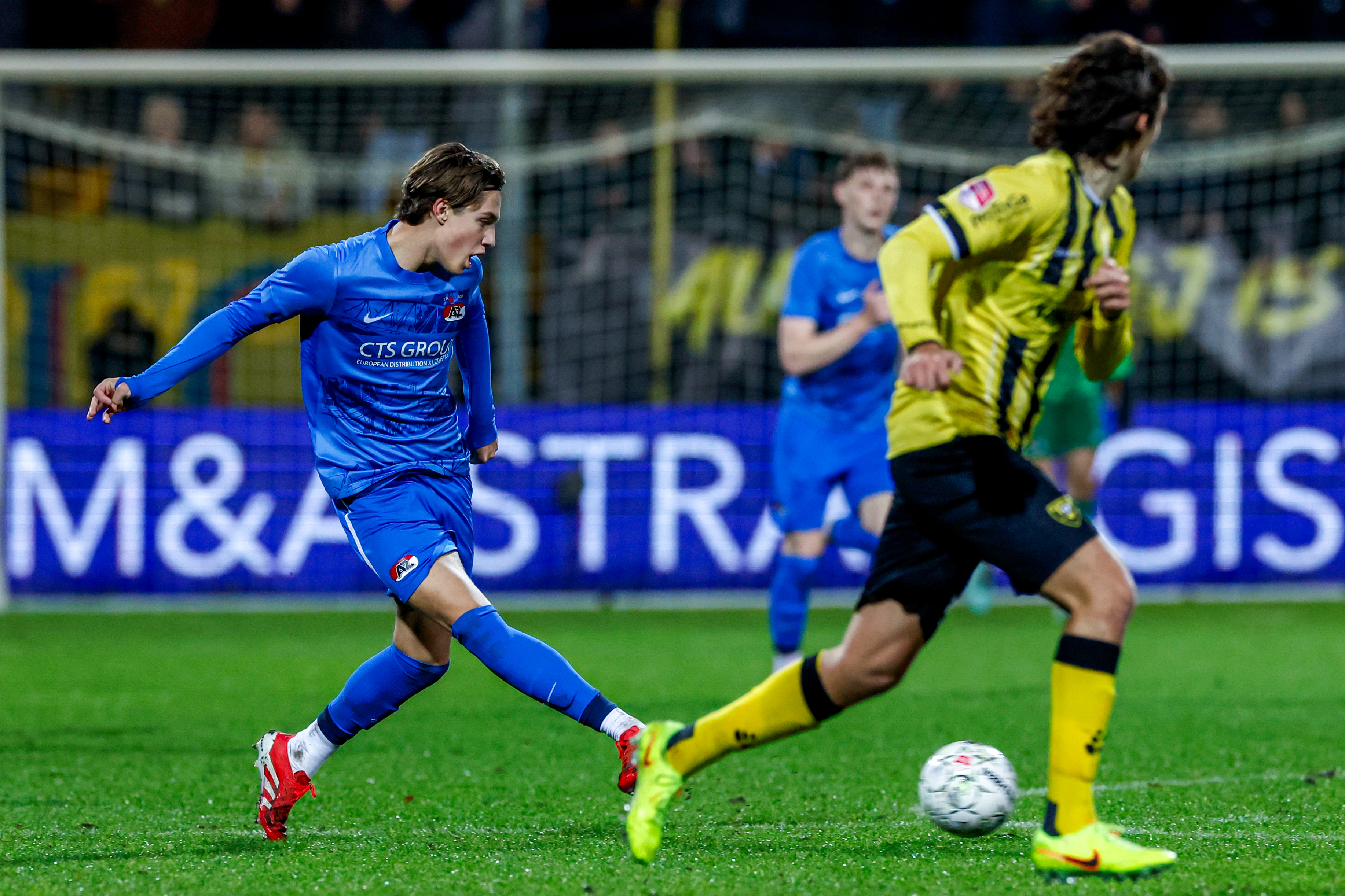 De snelle buitenspeler breekt door op de flank en schiet diagonaal voorlangs het Venlose doel. Het blijft voorlopig 0-1.